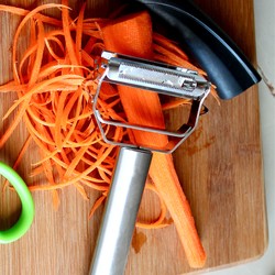<p>Stainless steel peeler, julienne peeler & noodle maker on a backercard</p>