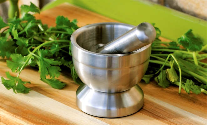 High quality, heavy duty, stainless steel makes easy work of crushing and grinding herbs and spices with this mortar and pestle. Holds up to 1 cup. Imported.