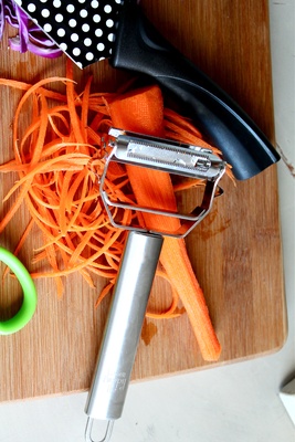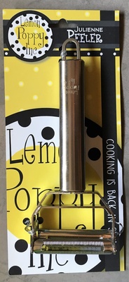 Peel veggies as usual or julienne strips of carrots into a perfect garden salad, vegetable soup or stir fry with this stainless steel julienne peeler. It is commercial grade so it's the only one you'll ever need. One of the blades will peel fruits and vegetables or push a little harder and that same blade will create wide, flat noodle strips for veggie lasagna and the other blade will quickly julienne skinny, grated strips. Imported.